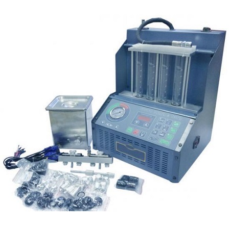 Стенд для промывки форсунок. Комплект предназначен для очистки топливной системы инжекторов без демонтажа форсунок. Данный набор также очищает и детали цилиндро-поршневой группы, из-за того, что принцип работы данного устройства основан на подаче чистящего вещества в цилиндры двигателя вместо обычного топлива. Для очистки используют специальную промывочную жидкость типа Лавр или Wynns.