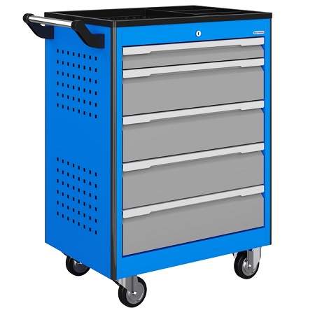 5 ящиков. Для хранения инструмента в ЕВРОЛОЖЕМЕНТАХ. Боковые панели с перфорацией (для установки аксессуаров). Цельносварная конструкция корпуса тележки. Центральный замок Euro-Lock. Шариковые направляющие полного выдвижения. Размеры (высота x ширина x глубина): 850 х 700 х 460 мм. Вес: 55 кг.