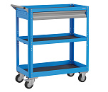 Корпус выполнен из листовой стали толщиной от 0,6 до 1,5 мм., покрыт полимерной порошковой краской. Размер 950х600х450 мм. С выдвижным ящиком на шариковых телескопических направляющих. Комплект резиновых ковриков. Общая равномерно-распределённая нагрузка на тележку - до 100 кг. Верхняя и средняя полка имеют высоту борта 40 мм., нижняя полка имеет высоту борта 60 мм. Размер 950х600х450 мм.