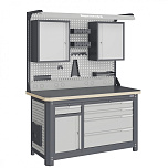 Нагрузка на столешницу 1500 кг. Столешница из листа влагостойкой фанеры марки ФСФ толщиной 40 мм и листом горячекатаной стали толщиной 5 мм. Рама верстака выполнена их холоднокатаной стали. Модуль верстака выполнен сварными. Ящики в модулях устанавливаются на шариковых телескопических направляющих полного выдвижения. Квадратная перфорация для установки крючков, держателей. Размеры: 1982x1993x743 мм.