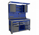 Нагрузка на столешницу 1500 кг. Столешница из листа влагостойкой фанеры марки ФСФ толщиной 40 мм и листом горячекатаной стали толщиной 5 мм. Рама верстака выполнена их холоднокатаной стали. Модуль верстака выполнен сварными. Ящики в модулях устанавливаются на шариковых телескопических направляющих полного выдвижения. Квадратная перфорация для установки крючков, держателей. Размеры: 1982x1493x743 мм