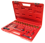 Набор для очистки посадочных мест форсунок дизельных автомобилей. В комплекте: - медные щетки: 18, 19, 21, 24, 26 х 2 шт. каждого размера; щетка для очистки: 9 х 100 мм.; 2 шт. - щетки: 300 мм. Х 2 шт.; 1 шт. - гибкий держатель; 1 шт. - адаптер щетки с держателем; 1 шт. - опорный элемент; 2 шт. - щетки металлические для очистки посадочных мест форсунок; 8 шт. - заглушки; 1 шт. - пластиковая втулка для щетки.