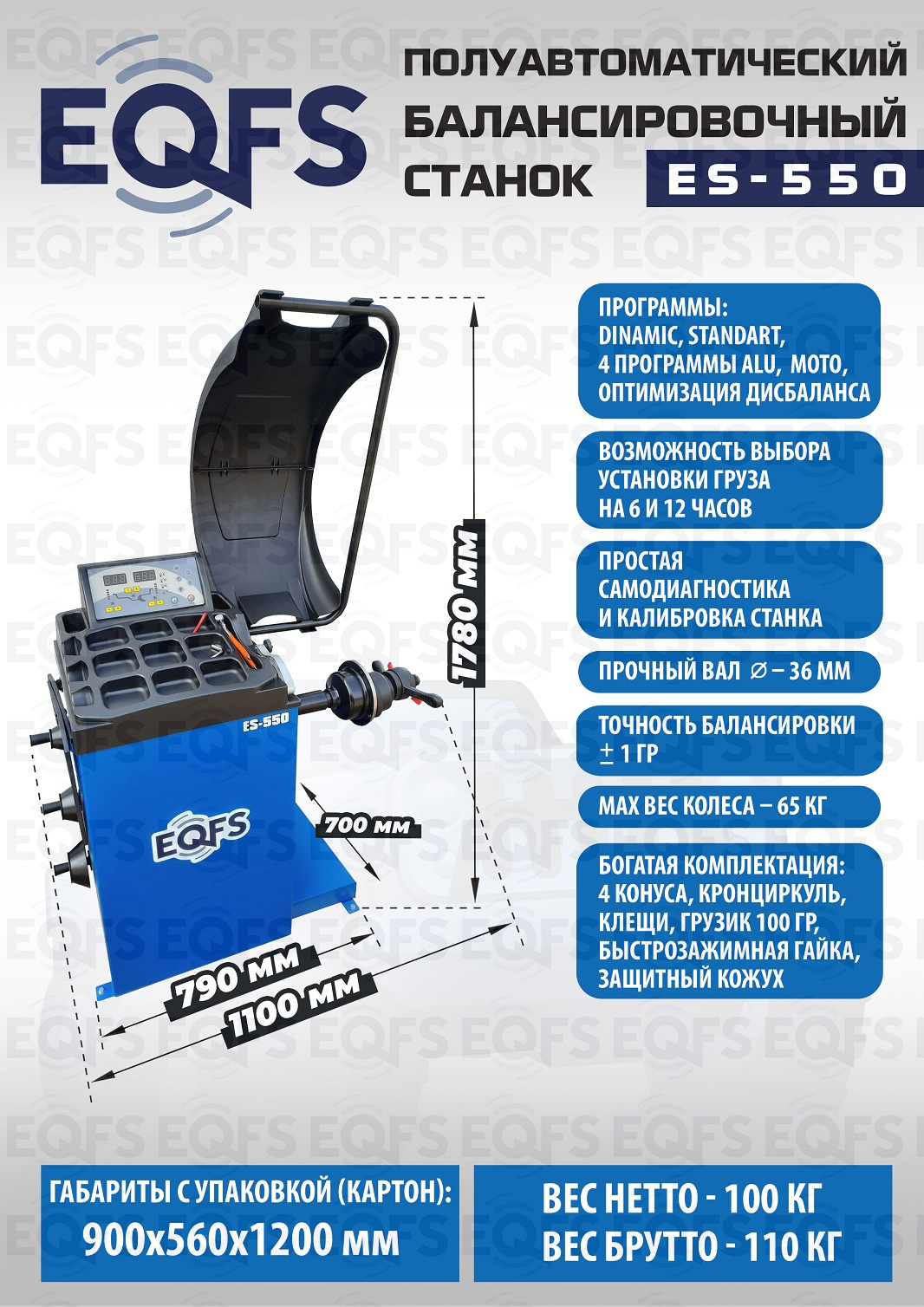 ES-550 Балансировочный стенд. Полуавтомат. Удобный и понятный интерфейс. Автозапуск опусканием кожуха. Автоматический ввод дистанции и диаметра диска. Лазерная навигация. Автокалибровка. Для колес легковых автомобилей, мотоциклов, «Газелей», «Спринтеров» с диаметром диска с резиной до 800 мм. Размеры диска: ширина 3–10” (76-254 мм) , диаметр диска 10–24” (254÷609 мм). Вес ≤ 65 кг. Вал- 36 мм. Точность ±1гр. 220 В. Режимы работы DINAMIC, STATIC, ALU1, ALU2, ALU3, ALUS, ST. Гарантия 12 мес.