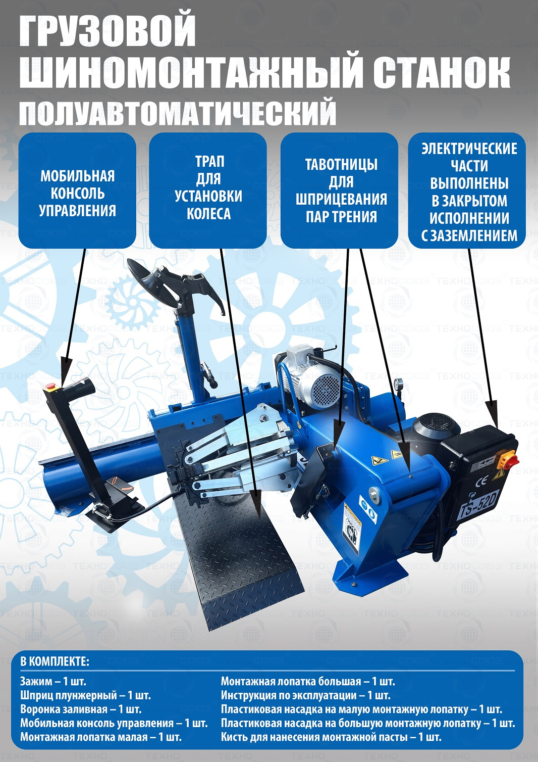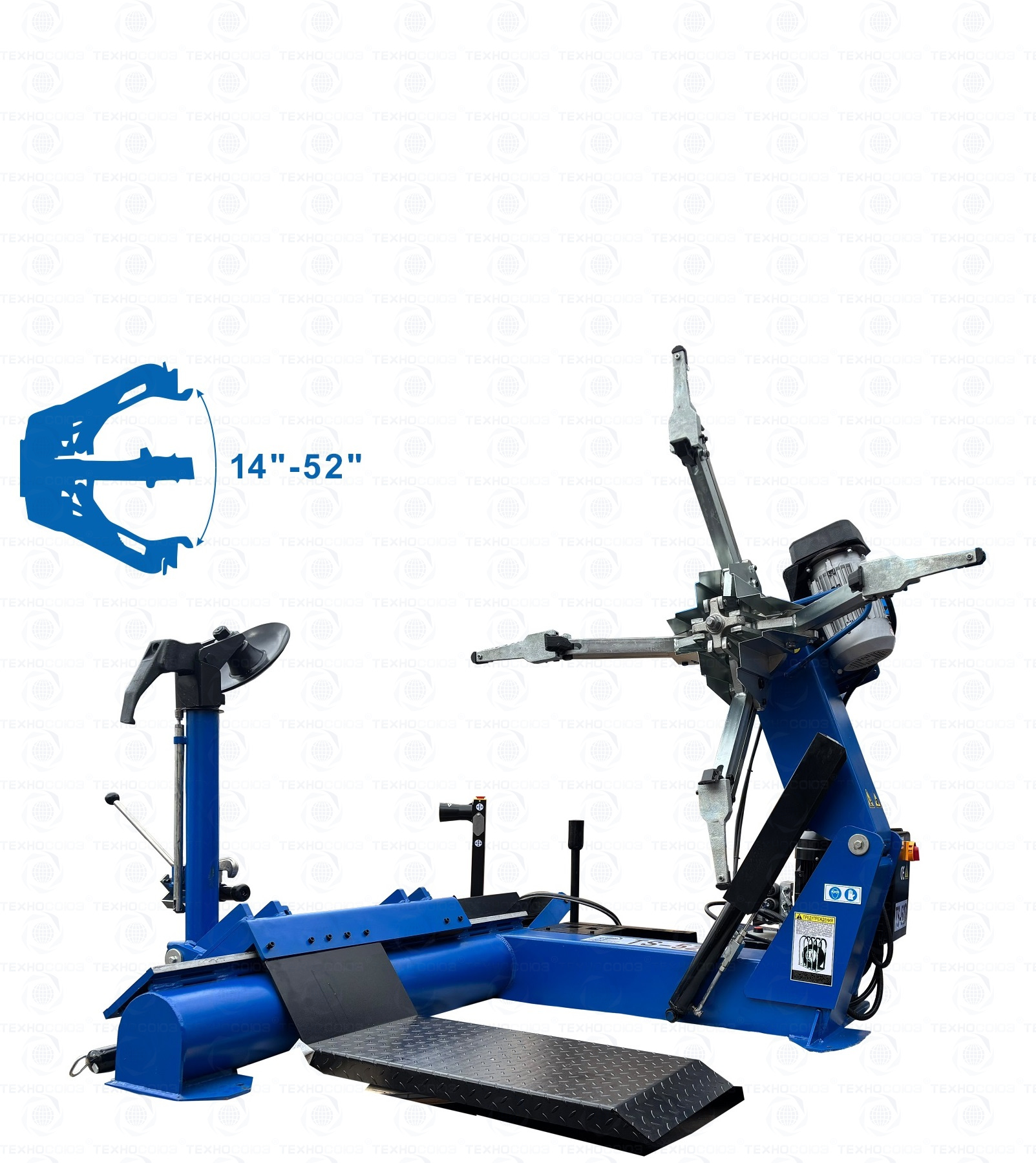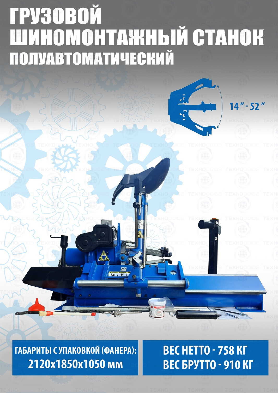 Комплект из TS-52D грузового шиномонтажного станка для дисков 14”-42”,  с удлинителями на захваты до 52” - очень качественный станок. За последние 9 лет ни одной рекламации!!!  Диски сталь + ALU Ø 14÷42” с адаптерами 14÷52”(опция). Максимальное колесо Ø2300 ширина 1050мм, вес до 1600кг. Моторы 2,2 + 2,2 кВт, 380В. Гарантия 12÷18мес. Гидронасос «BUCHER HIDRAULICS». Cтанок подходит для тракторов, сельхозтехники, еврофур и т.п.