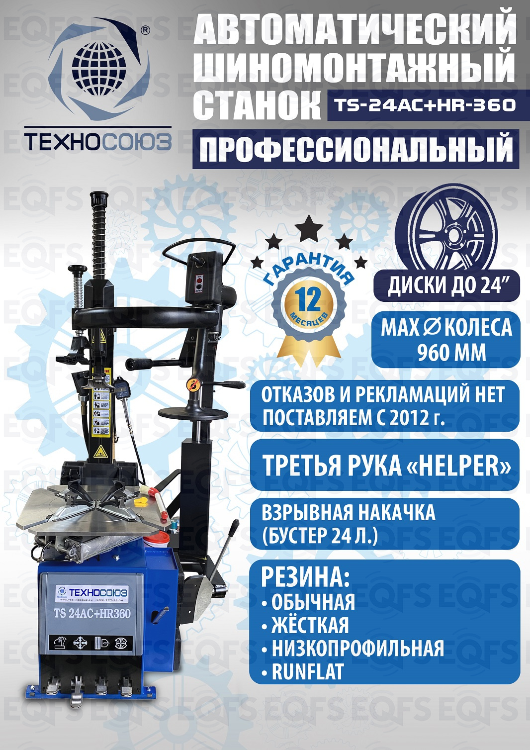 Автоматического шиномонтажного стенда TS-24AC+HR-360. В комплекте взрывная подкачка + третья рука для работы с низкопрофильными шинами и RanFlat! Для колес легковых автомобилей, легких грузовиков, микроавтобусов и коммерческой техники. Для дисков: внешний 10÷21”, внутренний 12÷24”. Напряжение 220/380В. Гарантия 18 мес. – наш монтаж, 12 мес. – самостоятельная установка.