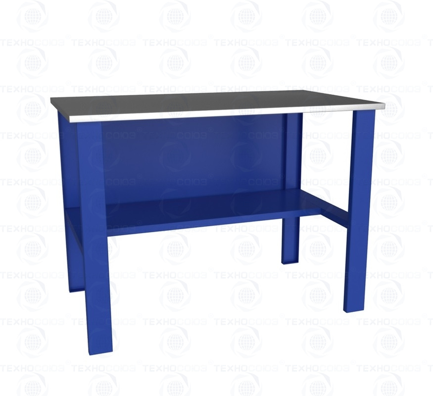 Столешница полностью фанерная и сверху покрыта слоем оцинкованного металла в 1 мм. Толщина фанеры составляет 24 мм. Столешница монтируется на опоры, произведенные из листового металла. Слесарный стол имеет максимально простую конструкцию, включающую одну нижнюю полку, столешницу и 4 опоры. Представленная модель изделия не имеет перфорированного экрана.