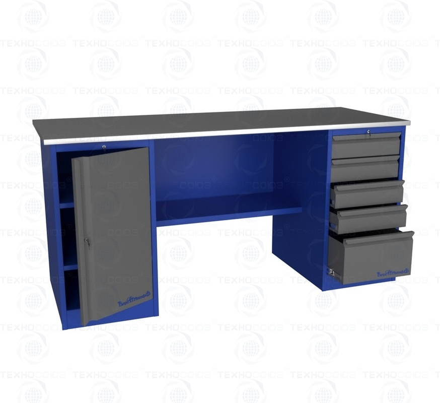 Верстак металлический двухтумбовый 1 тумба - 5 ящиков, 1 тумба с ящиками и  дверью, ц. замок, полка, оцинк. столешн. h=24 мм (фанера+оцинкованный металл 1мм). Размеры (ВхШхГ)    870х1800х700 мм. Вес 115 кг. Нагрузка на столешницу 300кг.