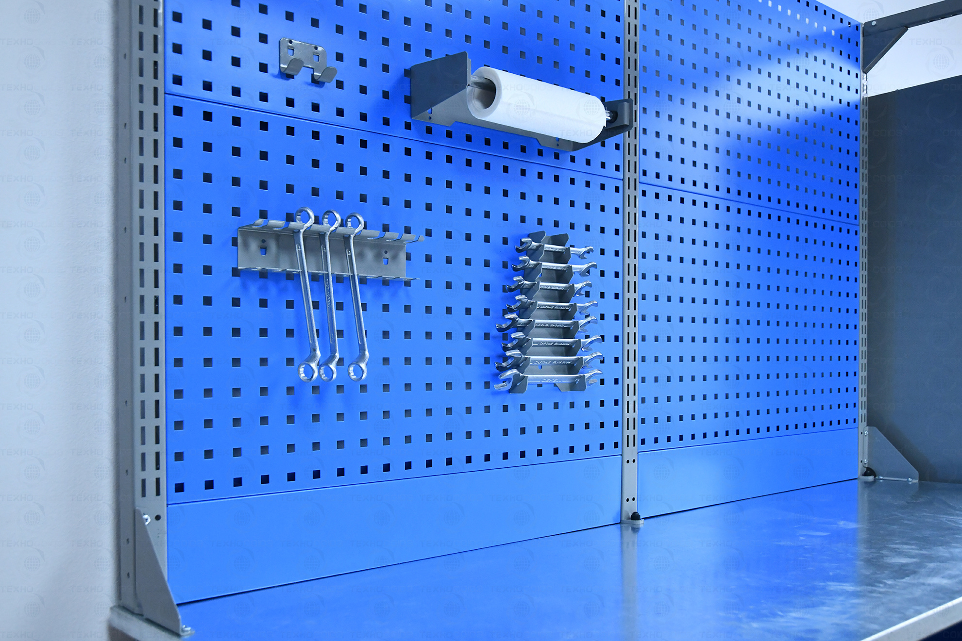 Верстак комплектуется полкой-стенкой, расположенной под столешницей для удобного размещения габаритного инструмента и оснастки.